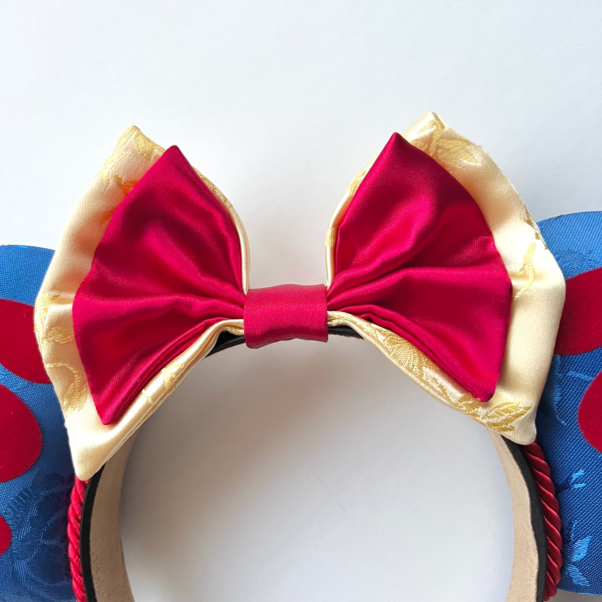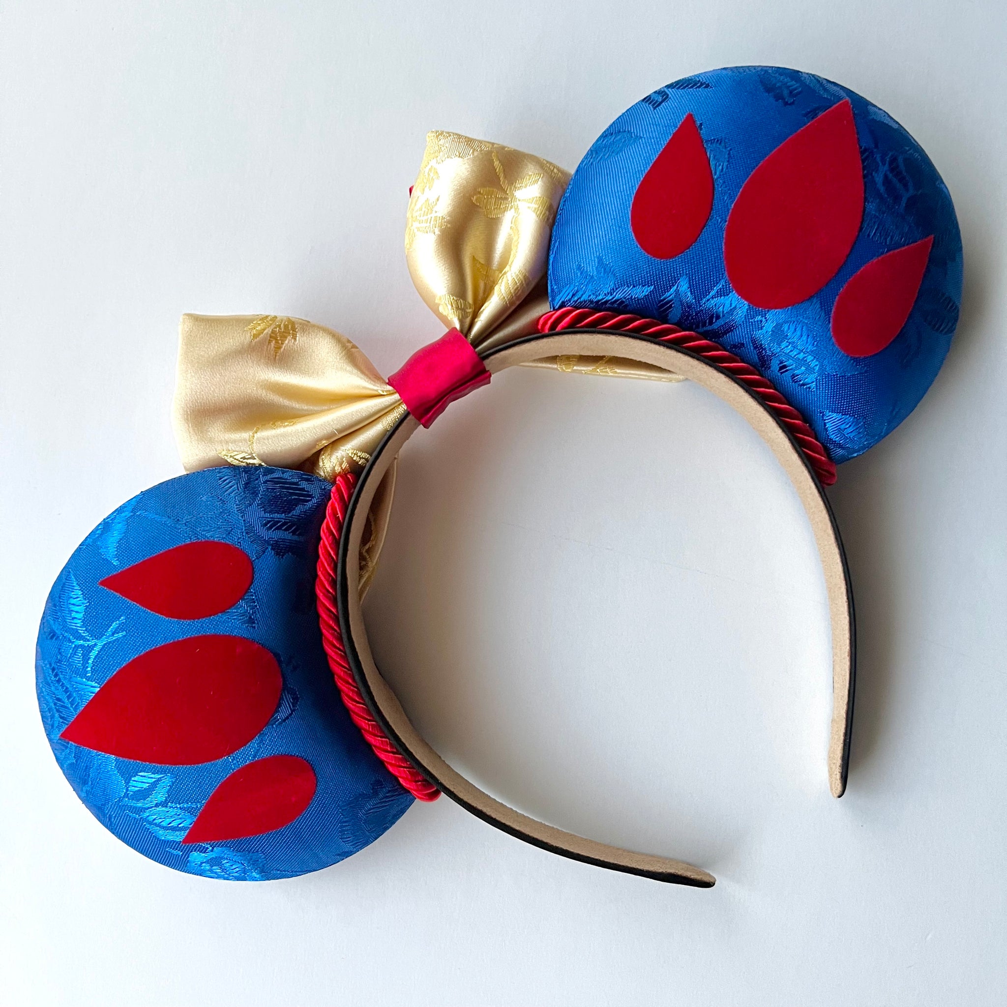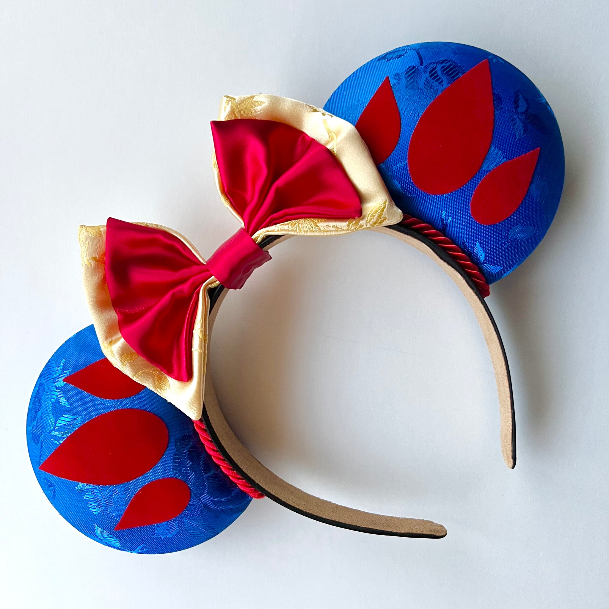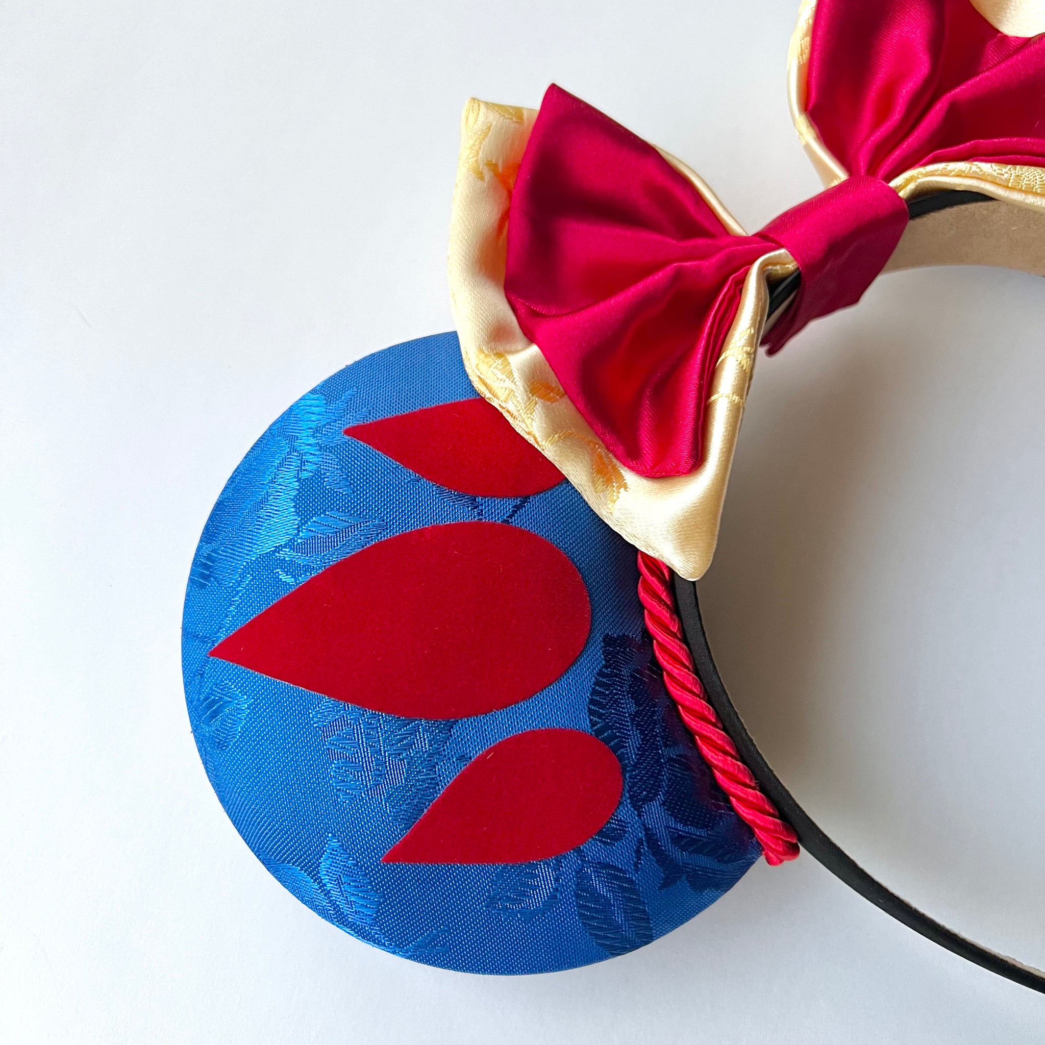 These ears are made with blue satin jacquard fabric and the symbols are made with a flocked velvety material. The bows are made with yellow floral printed jacquard and red satin fabrics